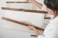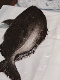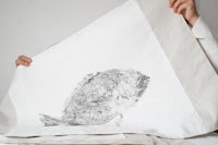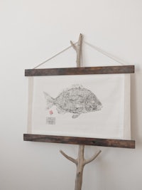 Inspired by the Japanese technique Gyotaku ("gyo" means fish and "taku" rubbing or impression), the original process uses paper and calligraphy ink to print the fish. LUZALBA Fish Prints reinterprets this technique and replaces paper with fabric (recycled hotel sheets) and paint with squid/cuttlefish black fresh ink.