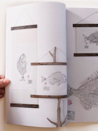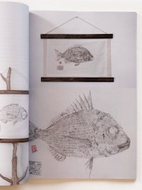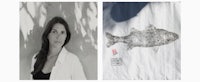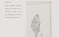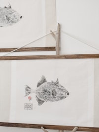 The process is like a ritual: it's a direct impression of a fish, caught through local artisanal fishing, opening the discourse to conscious consumption. The engraving method uses fresh fish, which once prepared (complete with scales) is covered in ink, namely squid or cuttlefish black ink. After this process, the decal/print is made using cotton fabric, thus registering all the original shapes and textures of the organism.